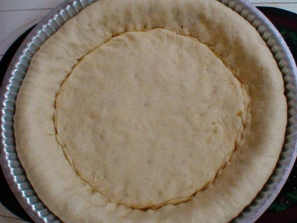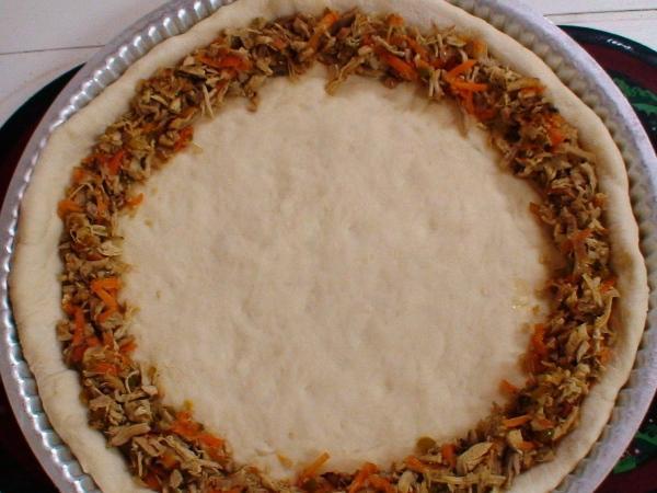 تفرد العجينه في الصينيه نضع الدجاج على جوانب العجينه