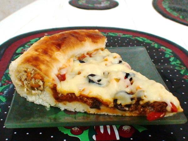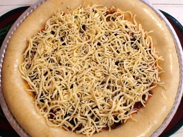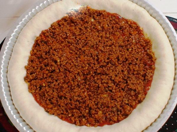 اللحم ثم الفلفل الرومي الملون ثم الزيتون نمسح جوانب العجينه بصفار البيض وندخل الصينيه الفرنوعندما تنضج العجينه نضع الجبنن حمرها من اعلى